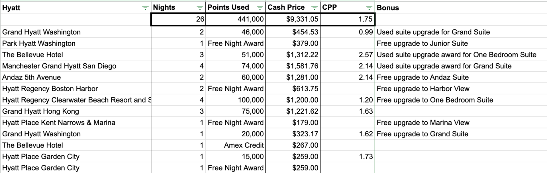 For the past two years I've posted my 2023 and 2024 Hyatt hotel stays using points and awards - saving me tens of thousands of dollars. This year we traveled considerably less with the birth of my son, but we still got some pretty cool trips in and new Hyatt hotels to review. Overall you can see that since we didn’t go to as many fancy places as in previous years (e.g., Maldives) so the CPP valuations is below the usual 2cpp you’d find at Hyatts on average.