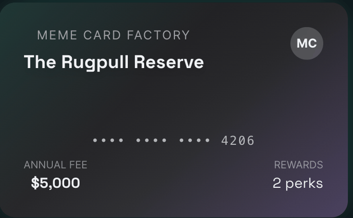 I created my own card called The Rugpull Reserve. It carries a $5,000 annual fee and offers cardholders perks like 420x Meme Rewards, early access to future rugpulls, and not much else - totally worth the annual fee.